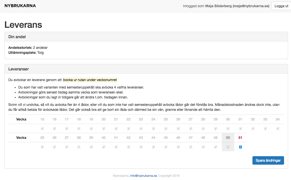 Genom att låta våra andelsägare själva logga in i Leveransplaneraren och sköta sina avbokningar (och påbokningar i de fall planerna förändras) där sparar vi odlare massor av tid, men undviker också många misstag. Innan vi hade Leveransplaneraren fick vi nämligen avbokningar via en mängd olika kanaler (Facebook, SMS, mejl, telefon, när vi stötte på en andelsägare etc). Detta gjorde att vi missade avbokningsmeddelanden, vi glömde skriva ner dem och hade heller inget bra system för vart vi skrev in dem. Det är också en ganska trist och meningslös kommunikation att ha med andelsägarna, bättre då att satsa på att kommunikationen man har handlar om viktigare saker.