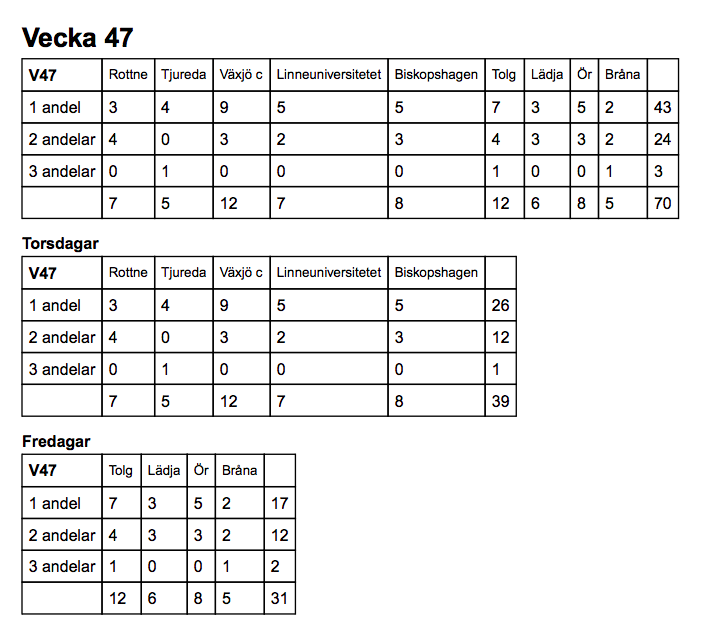 För att minimera vår och våra andelsägares klimatpåverkan har vi valt att ha hela 9 utlämningsplatser. Det innebär två leveransrundor för oss odlare. Men det möjliggör att de flesta av vår andelsägare har möjlighet att cykla eller promenera för att hämta sin kasse, eller iallafall stanna till med bilen på väg hem från jobbet. Leveransplaneraren gör det enkelt för oss att hålla ordning på hur många kassar som ska till vilken plats och möjliggör därmed ett sådant upplägg.